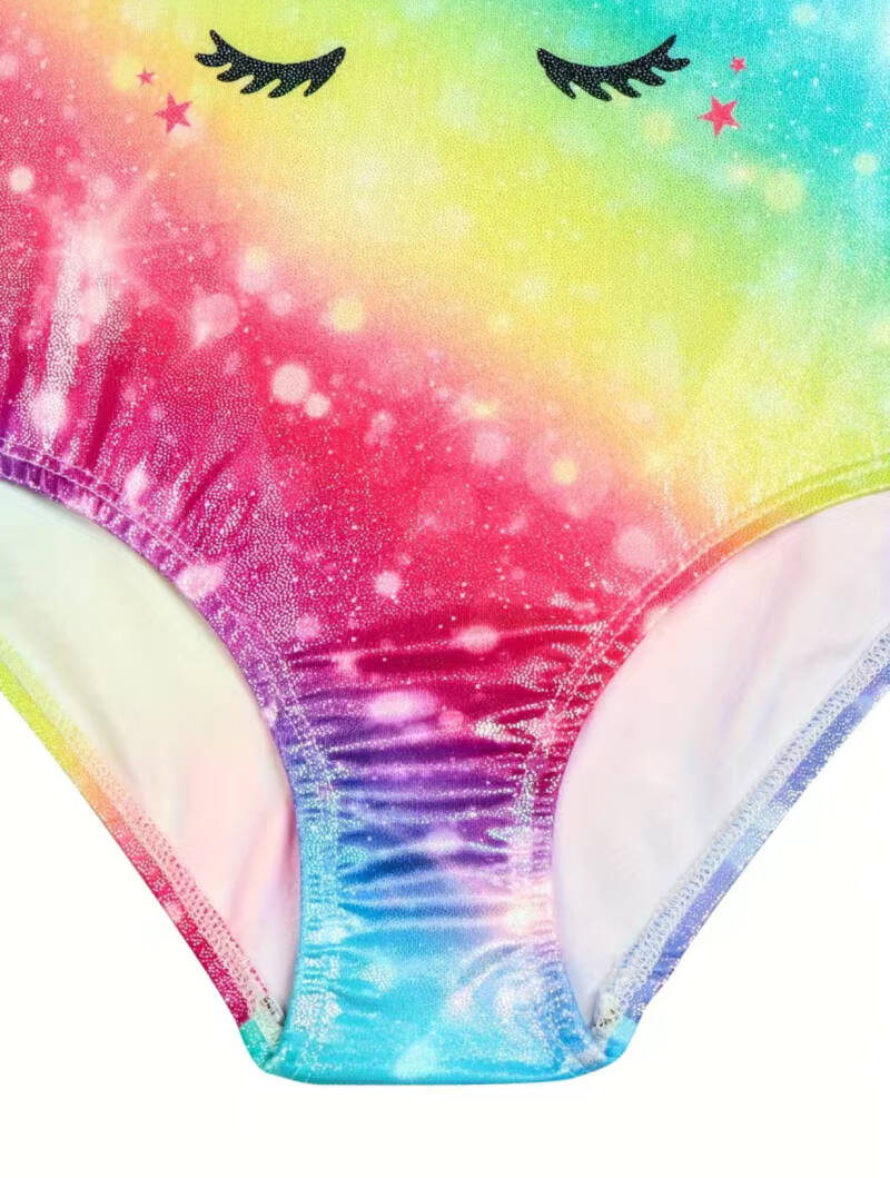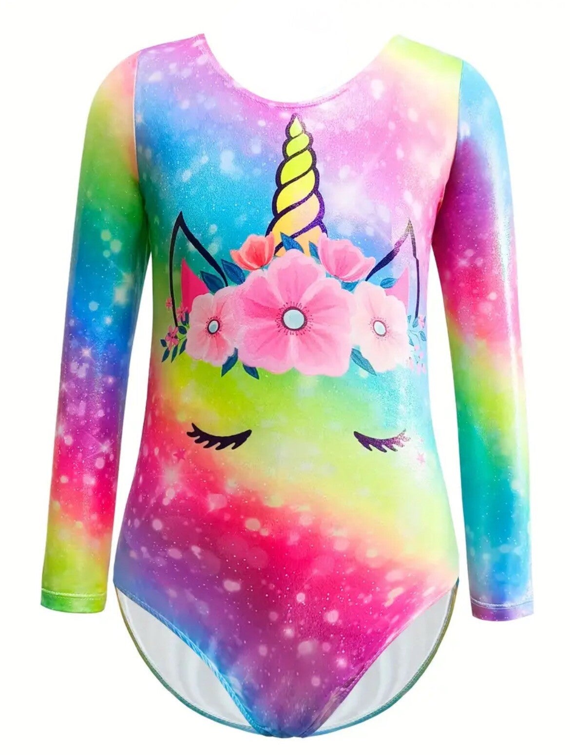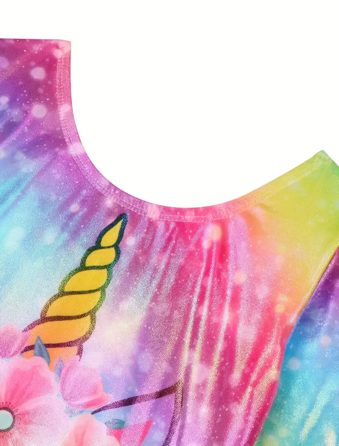Een prachtig, soepel polyester/elasthan turnpakje met lange mouwen in prachtig felle regenboogkleuren. Met een mooie Eenhoornprint op het voorpand. Het pakje heeft een glanzende touch d.m.v. subtiel glitterprint.