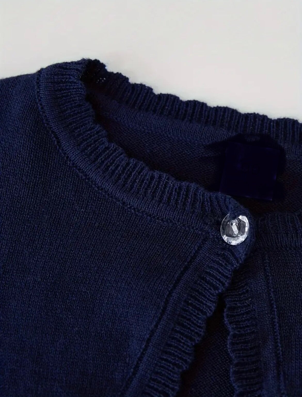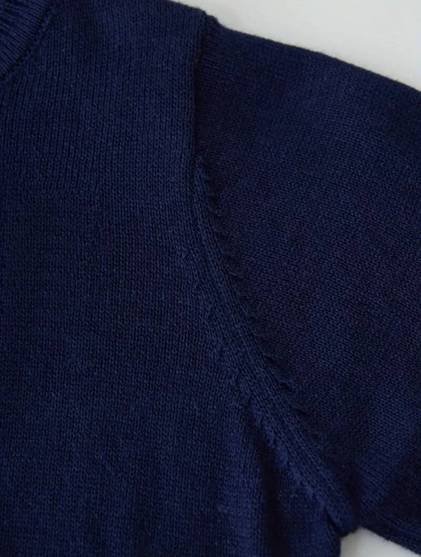 Marineblauw fijngebreid katoenen bolero met lange mouwen en eenknoopssluiting op de hals met een glanzend knoopjes. Afgewerkt met sierlijke boorden. 100% katoen.