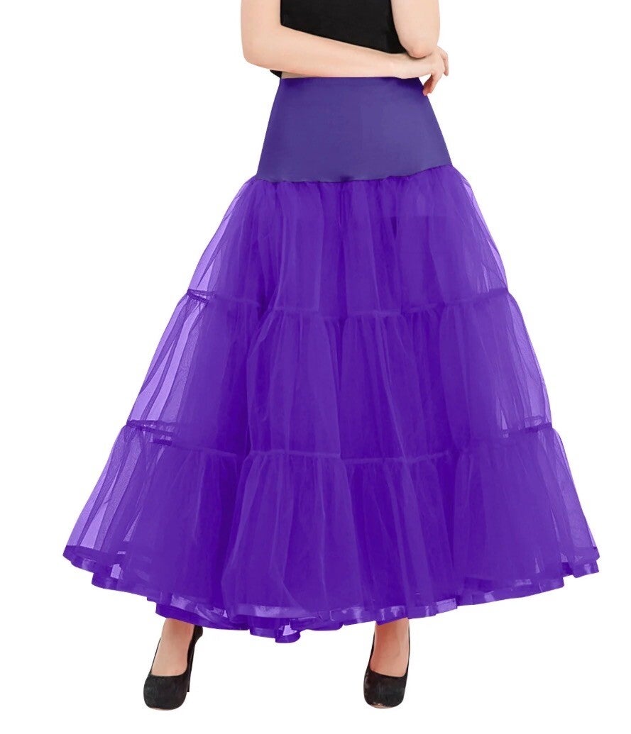 Een prachtige volle, lange (onder de knie), ruimvallende petticoat. Rockabilly jaren '50 vintage stijl. Polyester 3-laagse strokenrok met onderrok. De rok heeft een elastische taille, De onderkant is afgewerkt met een satijnen randje.