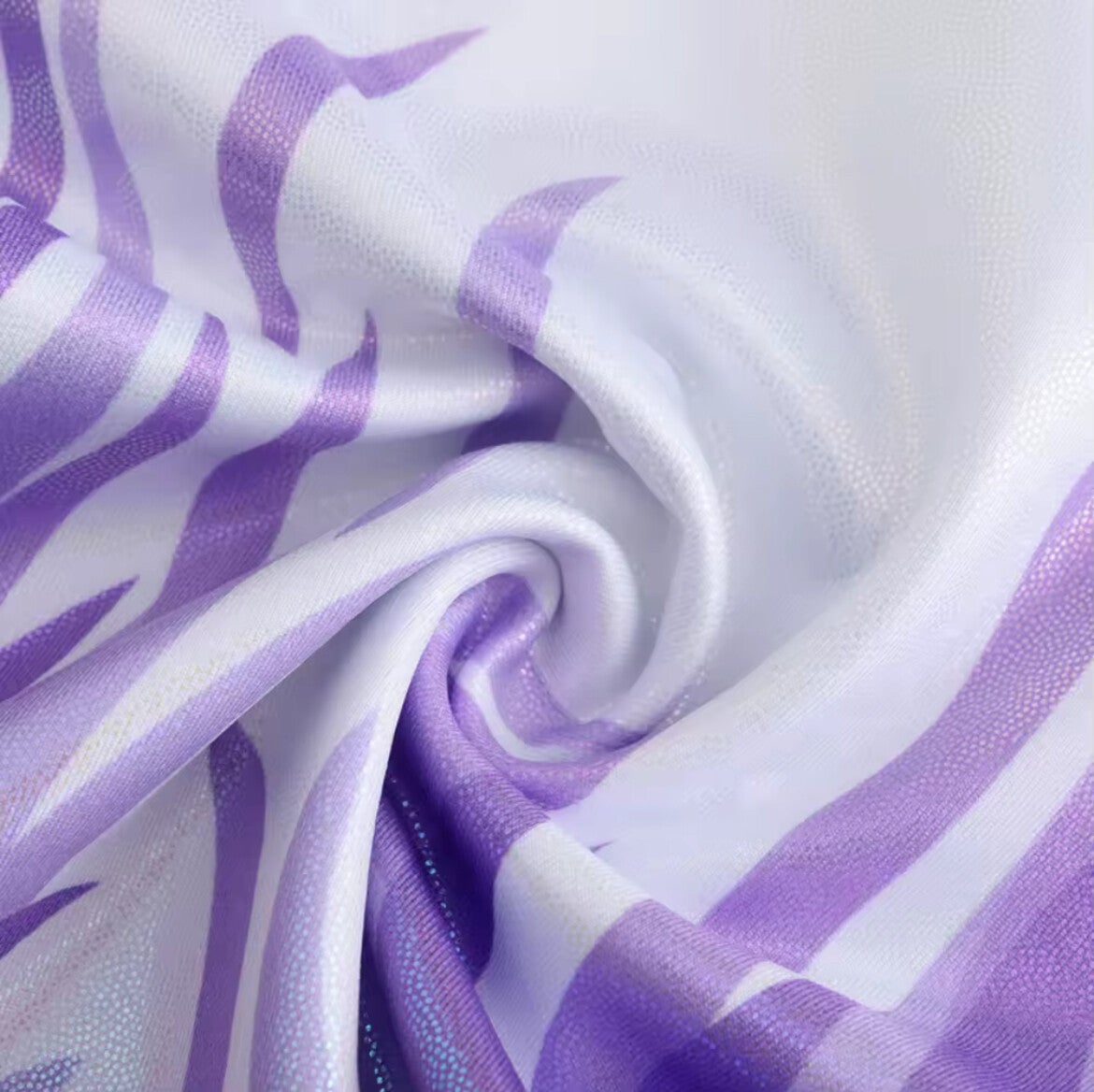 Prachtig driedelig turnsetje bestaande uit een turnpakje met lange mouwen, metallic kort broekje en bijpassende scrunchie.