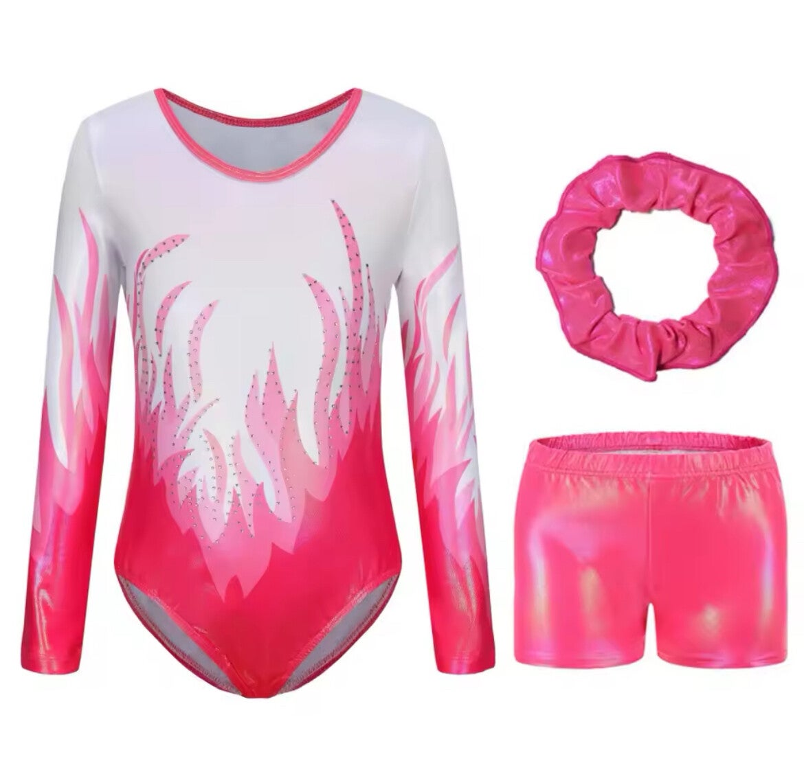 Prachtig driedelig turnsetje bestaande uit een turnpakje met lange mouwen, metallic kort broekje en bijpassende scrunchie.