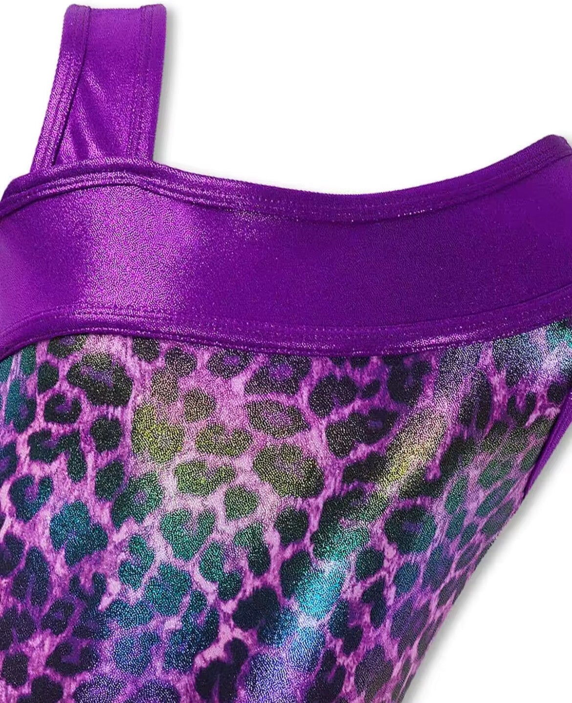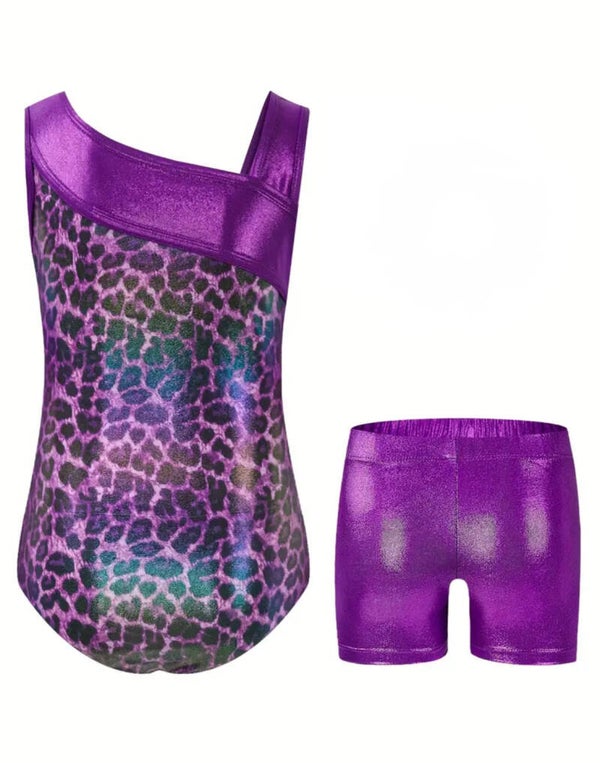 Een prachtig tweedelig, soepel polyester/elasthan turnsetje, bestaande uit een turnpakje, mouwloos model met meerkleurig luipaardprint en A-symmetrische schouderbandjes. Met bijpassend turnbroekje.