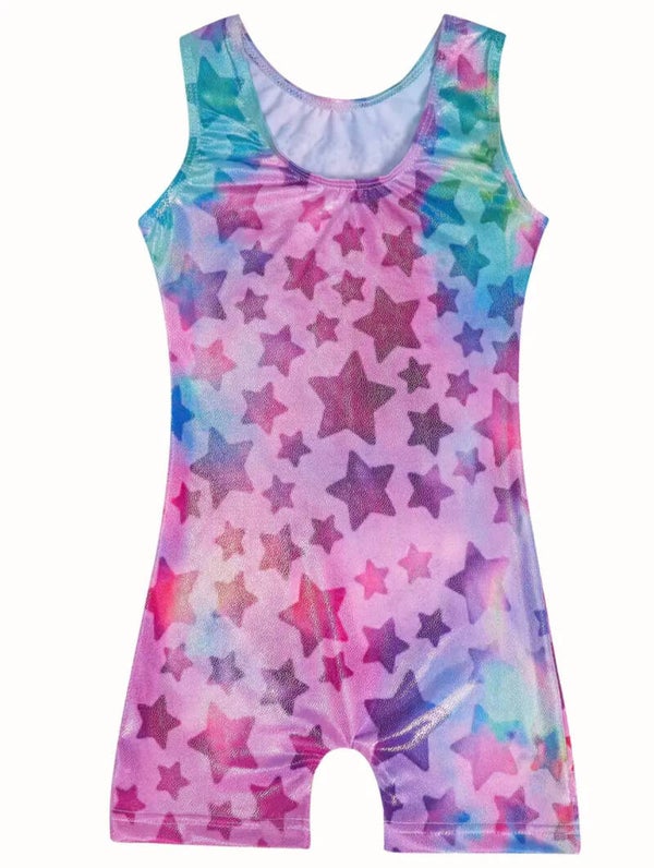 Een prachtig, soepel polyester/elasthan turnpakje, mouwloos model met korte broekspijpjes in prachtige pasteltinten en sterrenprint. Het pakje heeft een glanzende touch d.m.v. subtiel glitterprint.