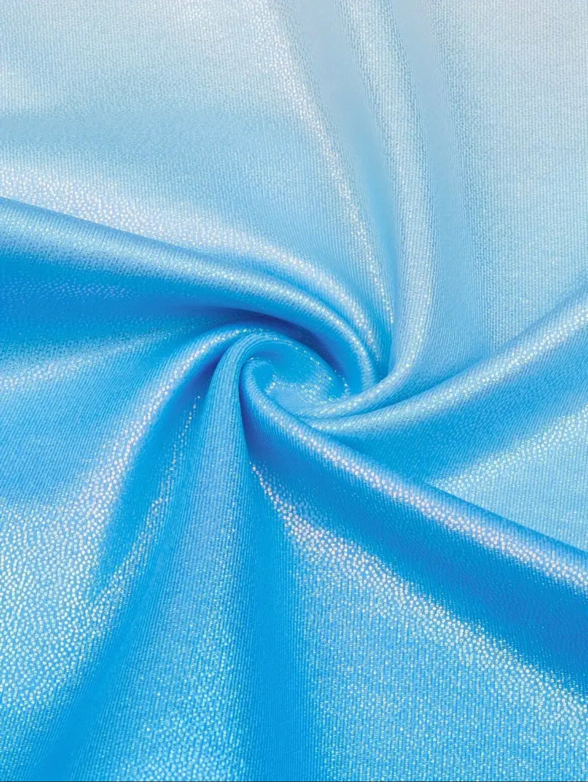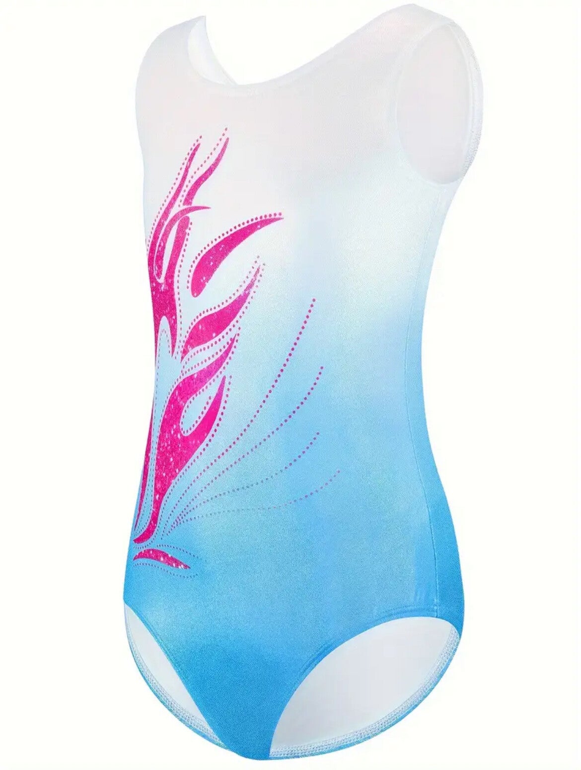 Een prachtig, soepel polyester/elasthan turnpakje, mouwloos model. Blauw onderpand, wit bovenpand, afgewerkt met een mooie roze vlam-achtige print.