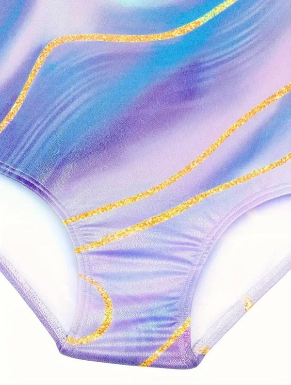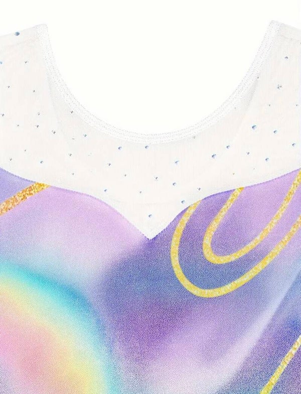 Een prachtig, soepel polyester/elasthan turnpakje, mouwloos model. Kleurig pastel spandex onderpand en wit fijngazig bovenpand, afgewerkt met mooie glittertjes. Mouwloos model.