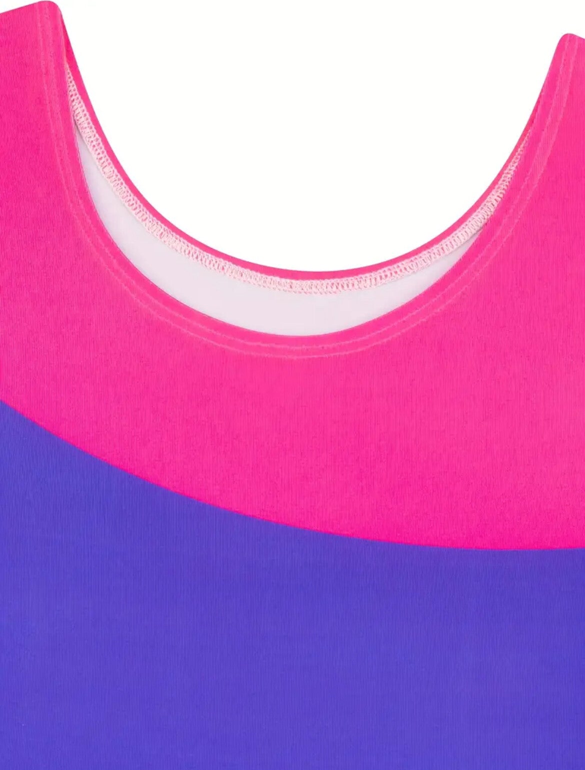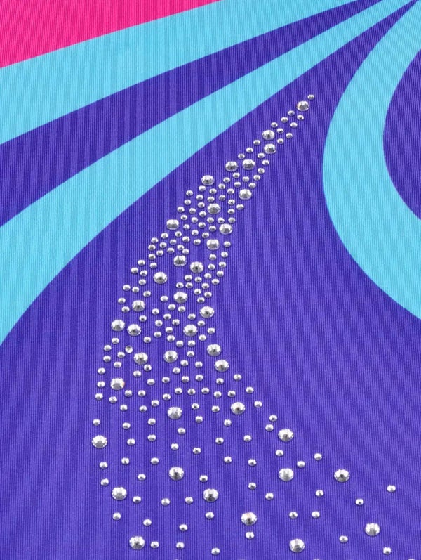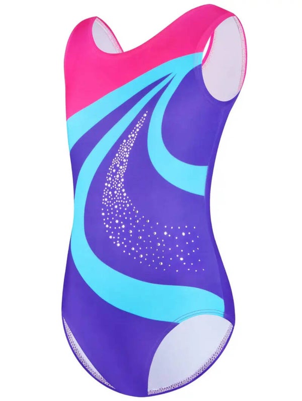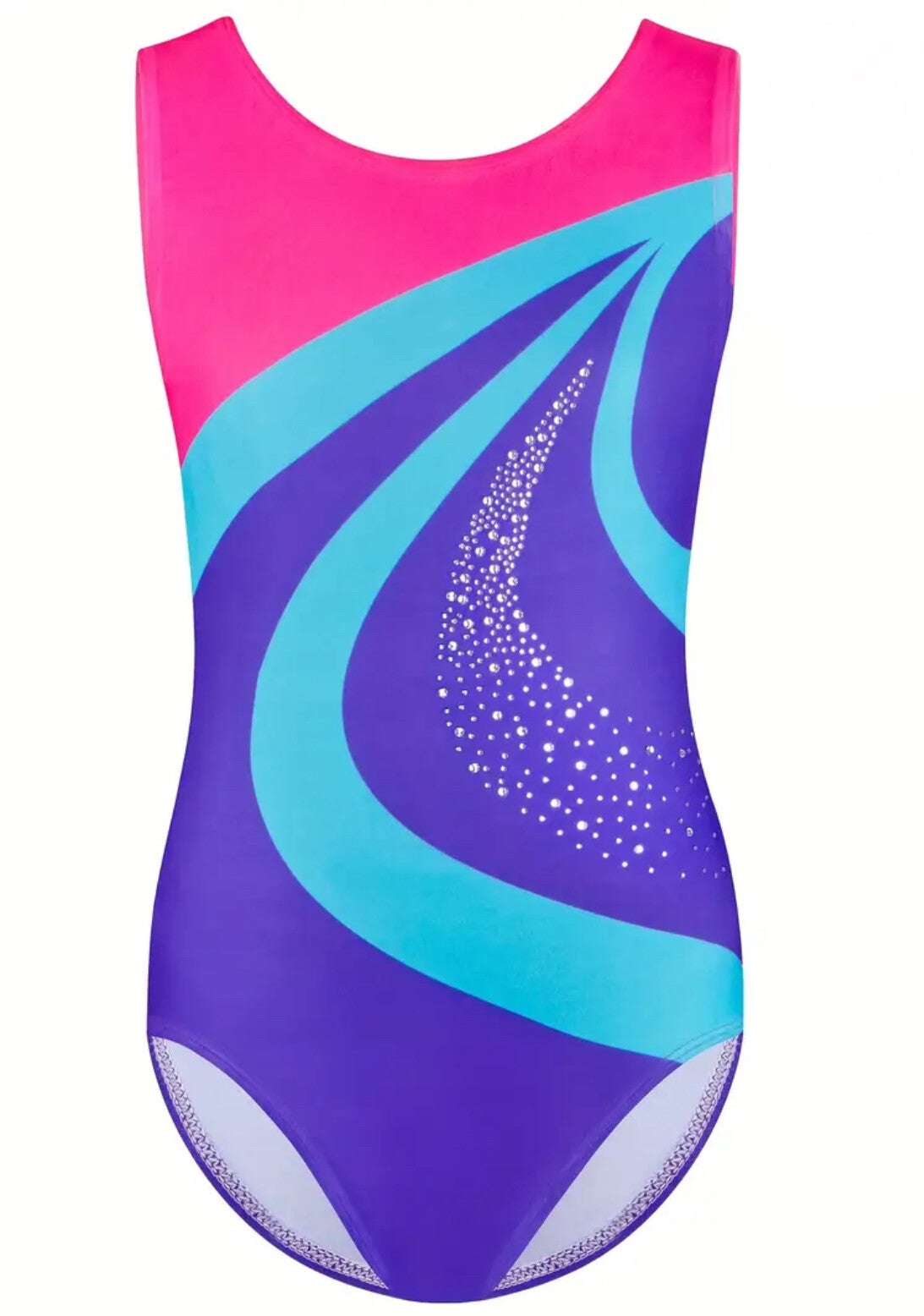 Een prachtig, soepel polyester/elasthan turnpakje, mouwloos model. Met de hoofdkleuren paars, roze en lichtblauw en heel mooi afgewerkt met glimmende steentjes.