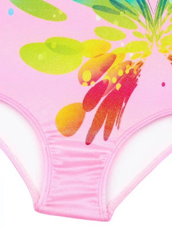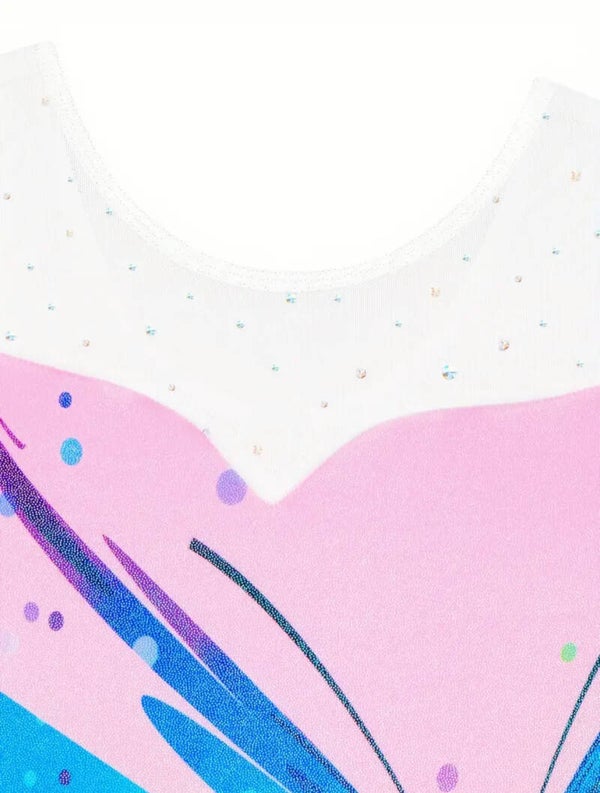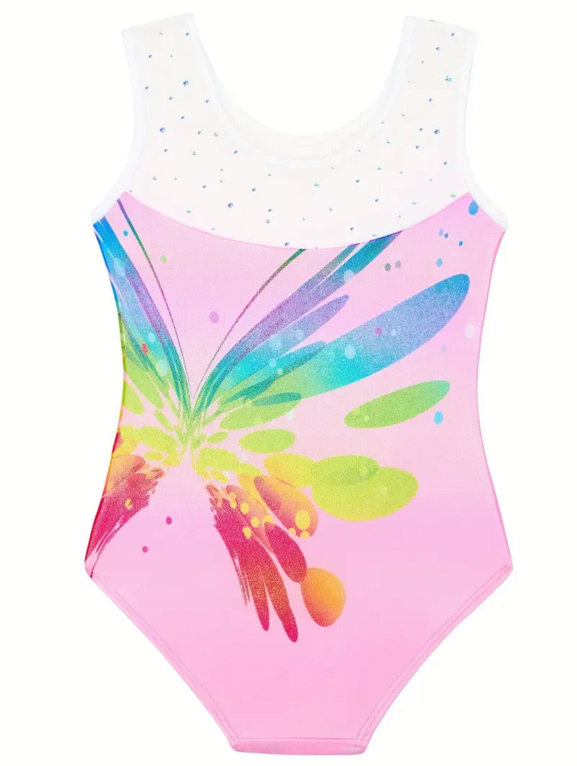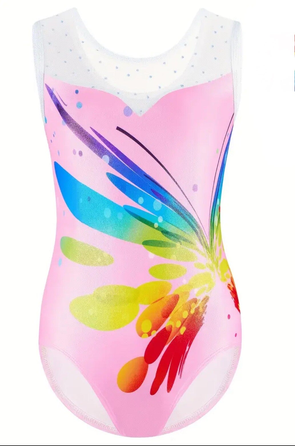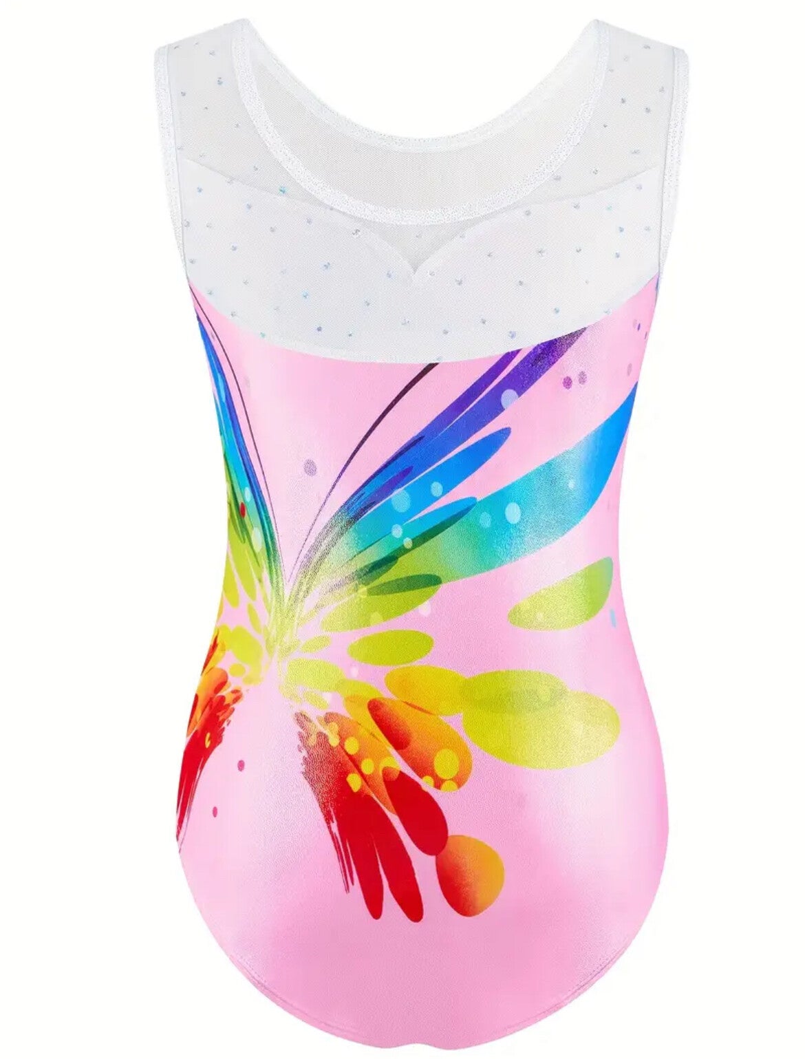 Een prachtig, soepel polyester/elasthan turnpakje, mouwloos model. Lichtroze basis met gekleurde fantasie vlinderprint in regenboogkleuren en wit fijngazig bovenpand, afgewerkt met mooie glittertjes. Mouwloos model.