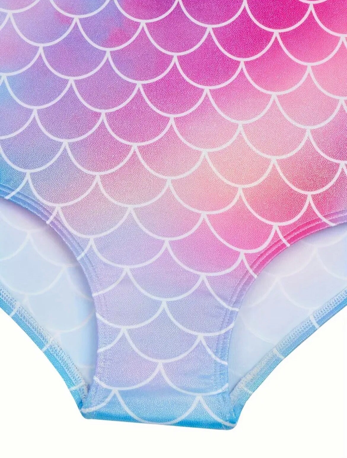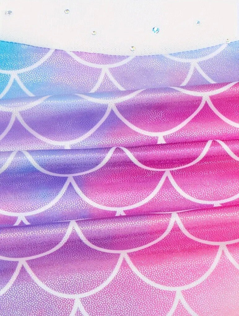Een prachtig, soepel polyester/elasthan turnpakje, mouwloos model. Blauw/roze basis met pasteltinten in zeemeerminnen-look en wit fijngazig bovenpand, afgewerkt met mooie glittertjes. Mouwloos model.