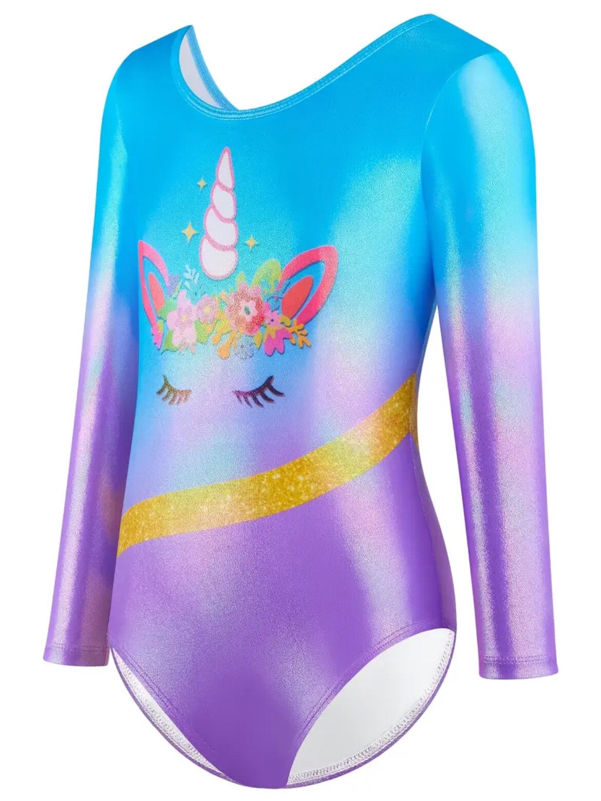 Een prachtig, soepel polyester/elasthan turnpakje met lange mouwen. Bovenpand lichtblauw overgaand in lila met een mooie Eenhoornprint op het voorpand. Het pakje heeft een metalic touch d.m.v. een subtiele glansprint.