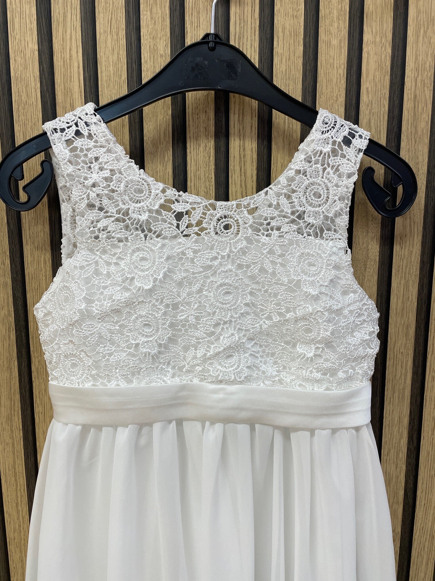 Prachtig gebroken wit bruidsmeisjesjurk waarvan de eenvoud siert! Kanten mouwloos bovenlijfje, chiffon met kateon/poluester onderrok. Met ritssluiting op het achterpand. Tijdloos model, geschikt voor bruidsmeisjes, maar ook voor de Eerste Communie.
