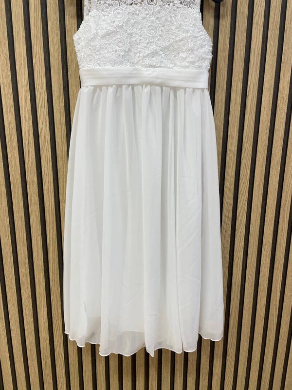 Prachtig gebroken wit bruidsmeisjesjurk waarvan de eenvoud siert! Kanten mouwloos bovenlijfje, chiffon met kateon/polyester onderrok. Met ritssluiting op het achterpand. Tijdloos model, geschikt voor bruidsmeisjes, maar ook voor de Eerste Communie.