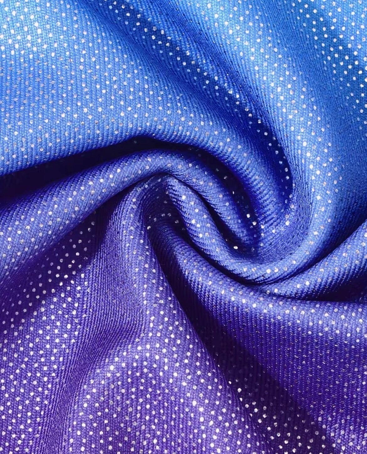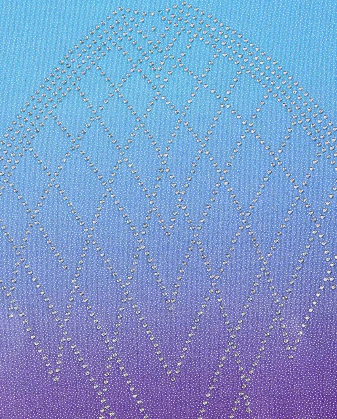 Een prachtig, soepel polyester/elasthan turnpakje, mouwloos model. Lila onderpand, lichtblauw bovenpand, afgewerkt met prachtige glanssteentjes op het voorpand. Witte biesjes op de hals en