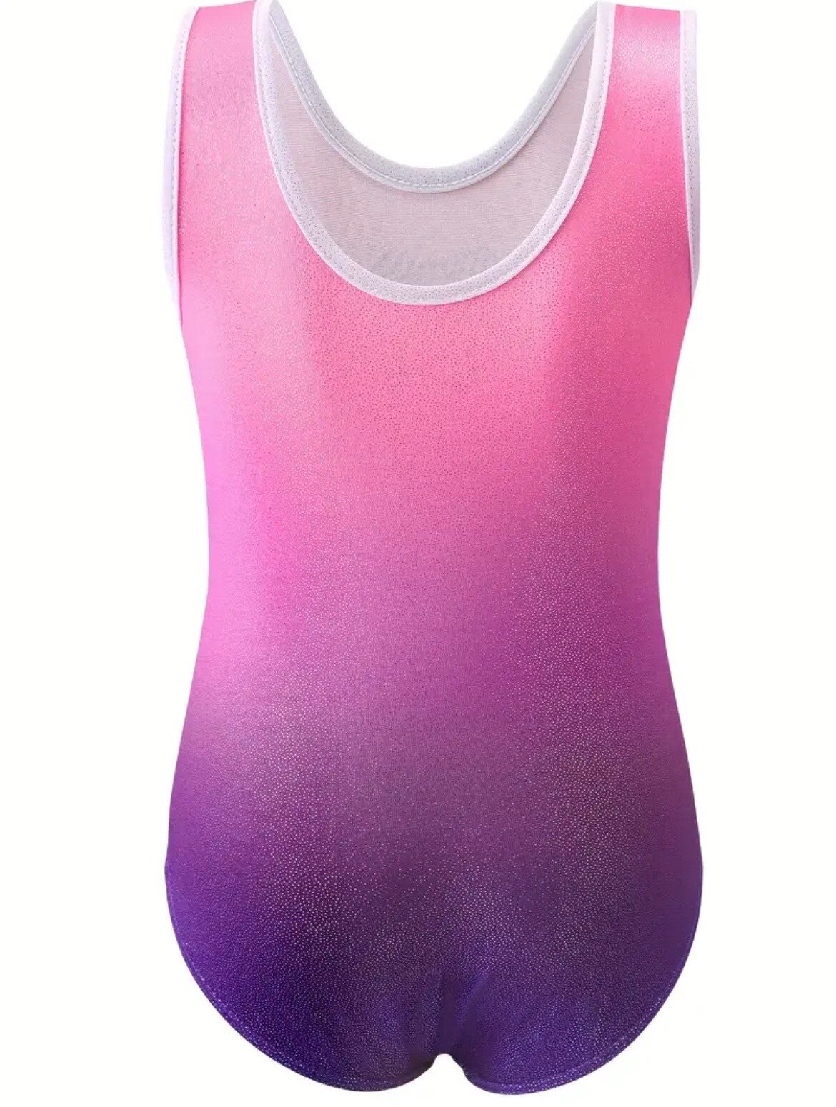 Een prachtig, soepel polyester/elasthan turnpakje, mouwloos model. Lila onderpand, roze bovenpand, afgewerkt met prachtige glanssteentjes op het voorpand. Witte biesjes op de hals en armsgaten.